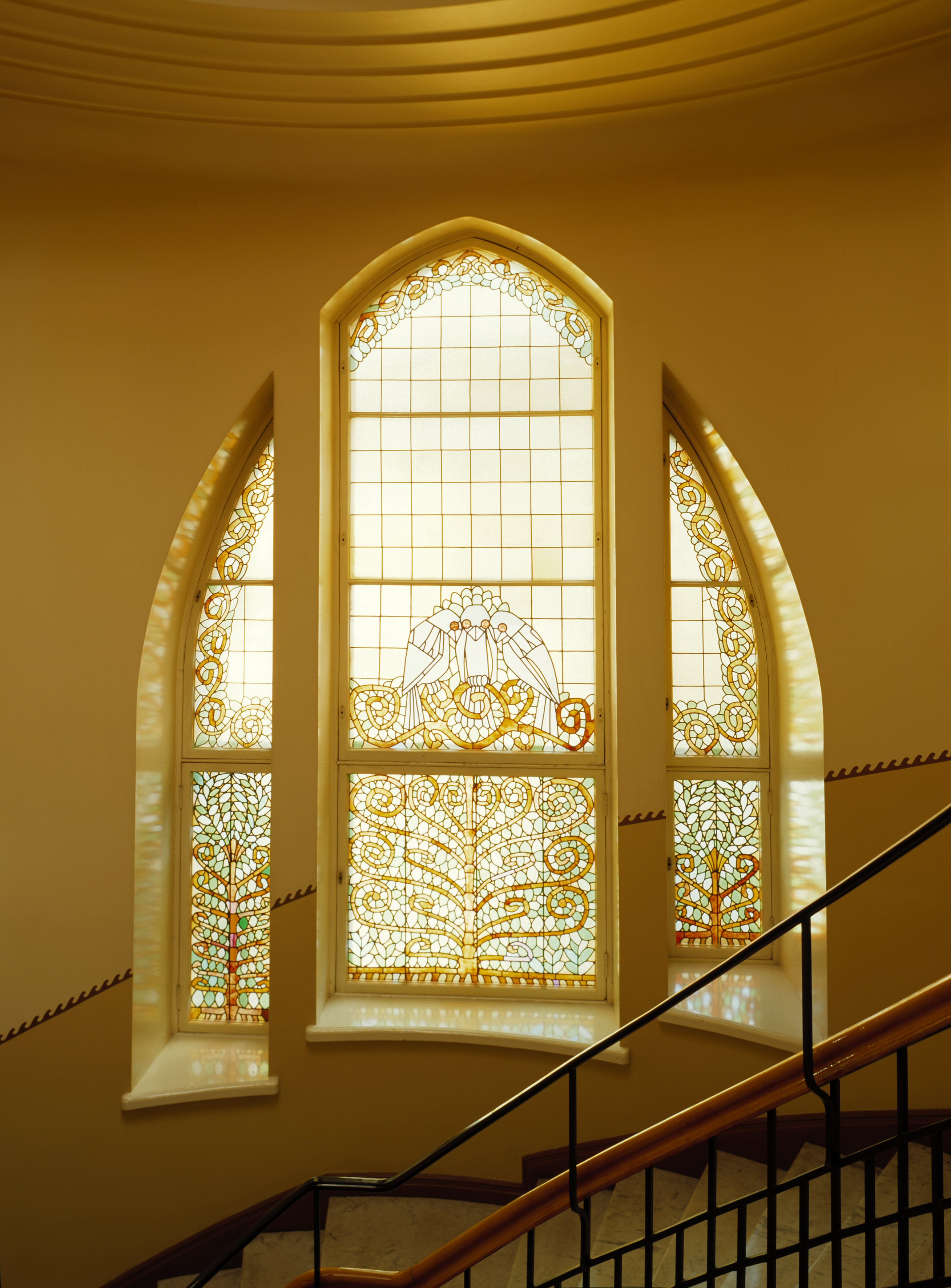 | S. Wuorion maalausliikkeen toteuttama lasimaalaus Pohjolan talon porraskäytävässä. |